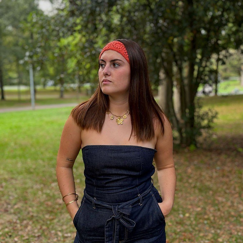 Bandeau en crochet fait main avec du coton recyclé.
